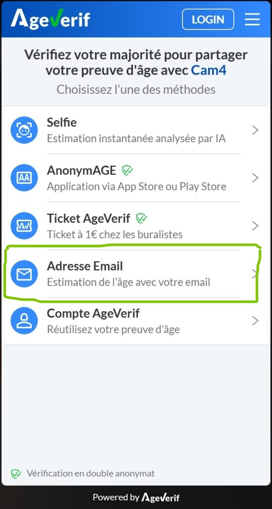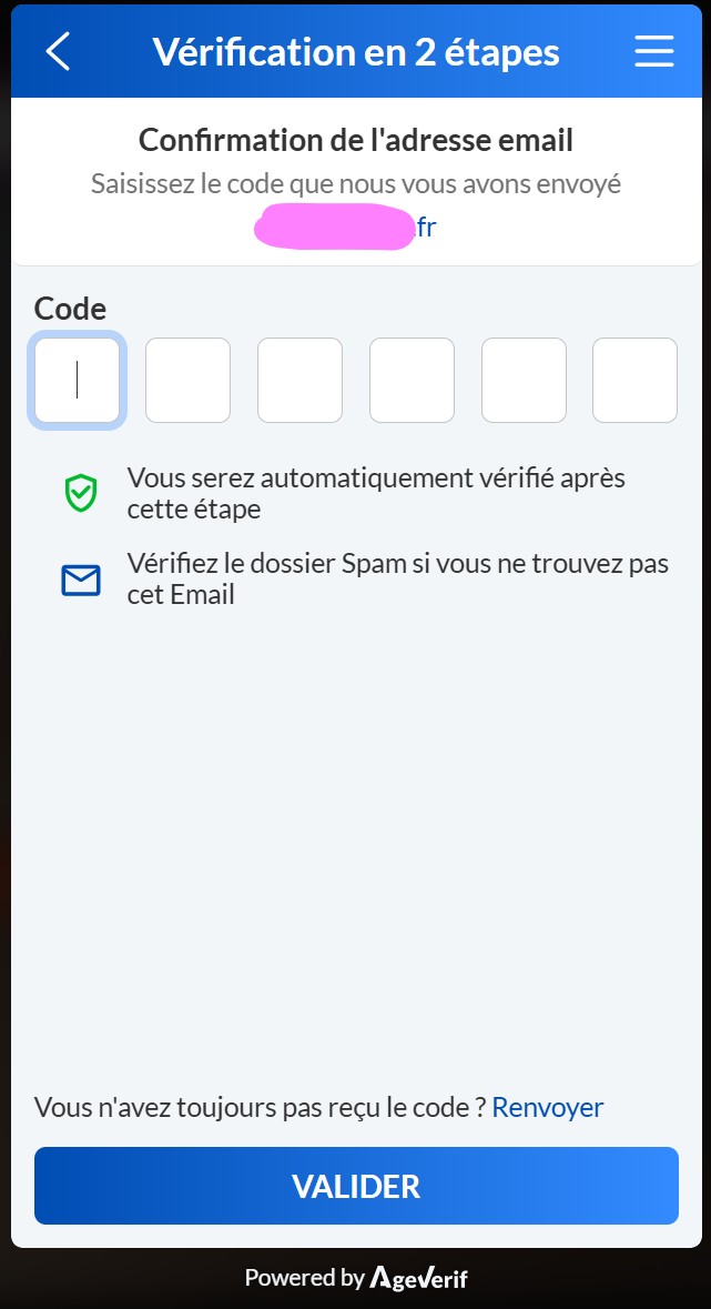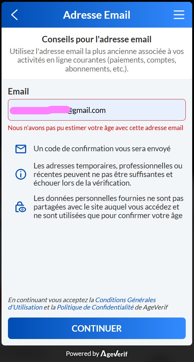 - Entrez votre adresse email sur la page AgeVerif. ( cette adresse email ne sera pas transmis à CAM4
