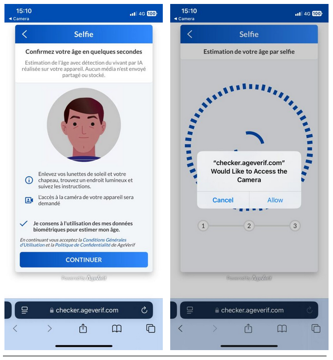 “A partir du 26 Mai 2025 et conformément à la loi Française, nous devons vérifier l’âge des utilisateurs et des membres de CAM4 toutes les 60 min. Suite à ceci , CAM4 utilisera AGEVERIF, une société tierce pour vous assurer qu’aucune de vos données personnelles sont stockées sur CAM4”